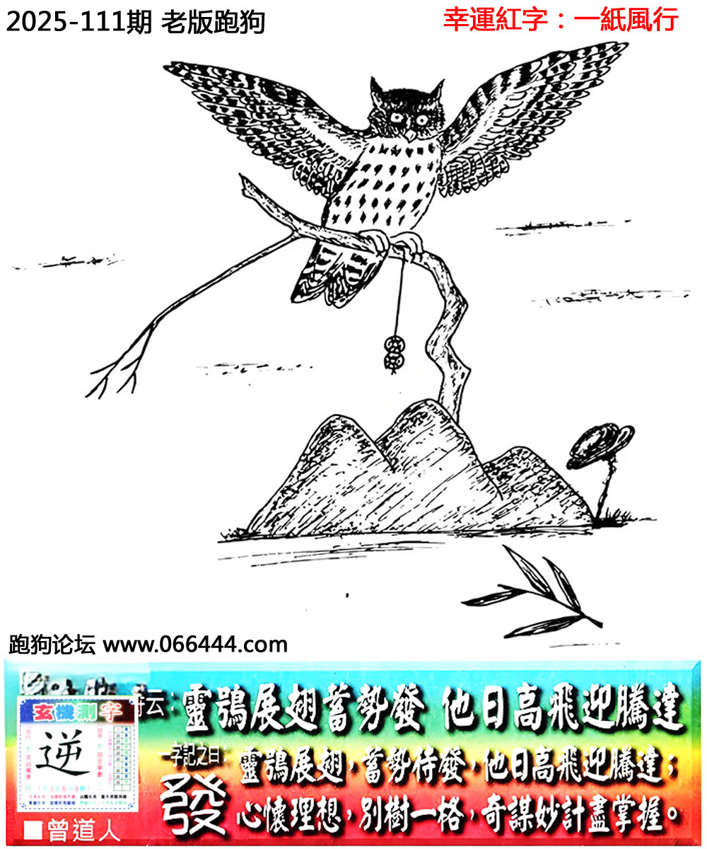 111期老版跑狗一字記之曰:【發】 詩雲:靈鴞展翅蓄勢發,他日高飛迎騰達。 靈鴞展翅,蓄勢待發,他日高飛迎騰達; 心懷理想,別樹一格,奇謀妙計盡掌握。 玄機測字:《逆》