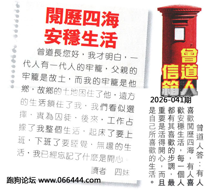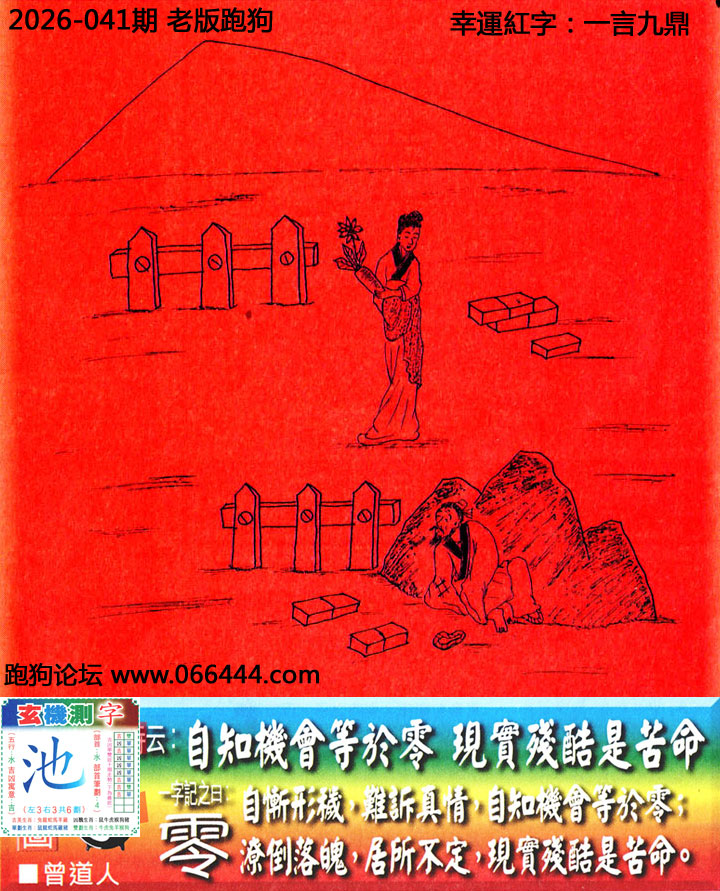 041期老版跑狗一字記之曰:【零】 詩雲:自知機會等於零,現實殘酷是苦命。 自慚形穢,難訴真情,自知機會等於零; 潦倒落魄,居所不定,現實殘酷是苦命。 玄機測字:《池》