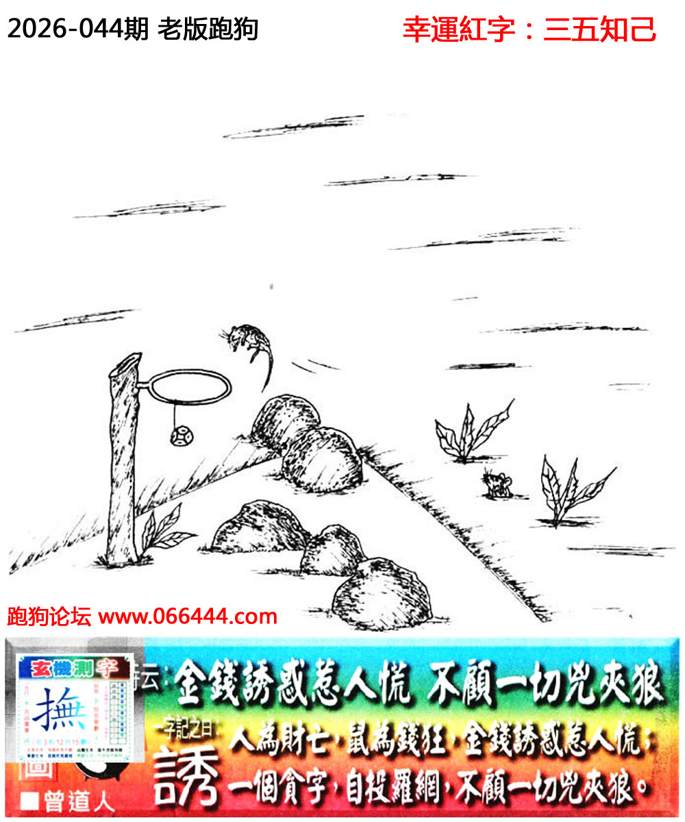 044期老版跑狗一字記之曰:【誘】 詩雲:金錢誘惑惹人慌,不顧一切兇夾狼。 人為財亡,鼠為錢狂,金錢誘惑惹人慌; 一個貪字,自投羅網,不顧一切兇夾狼。 玄機測字:《撫》